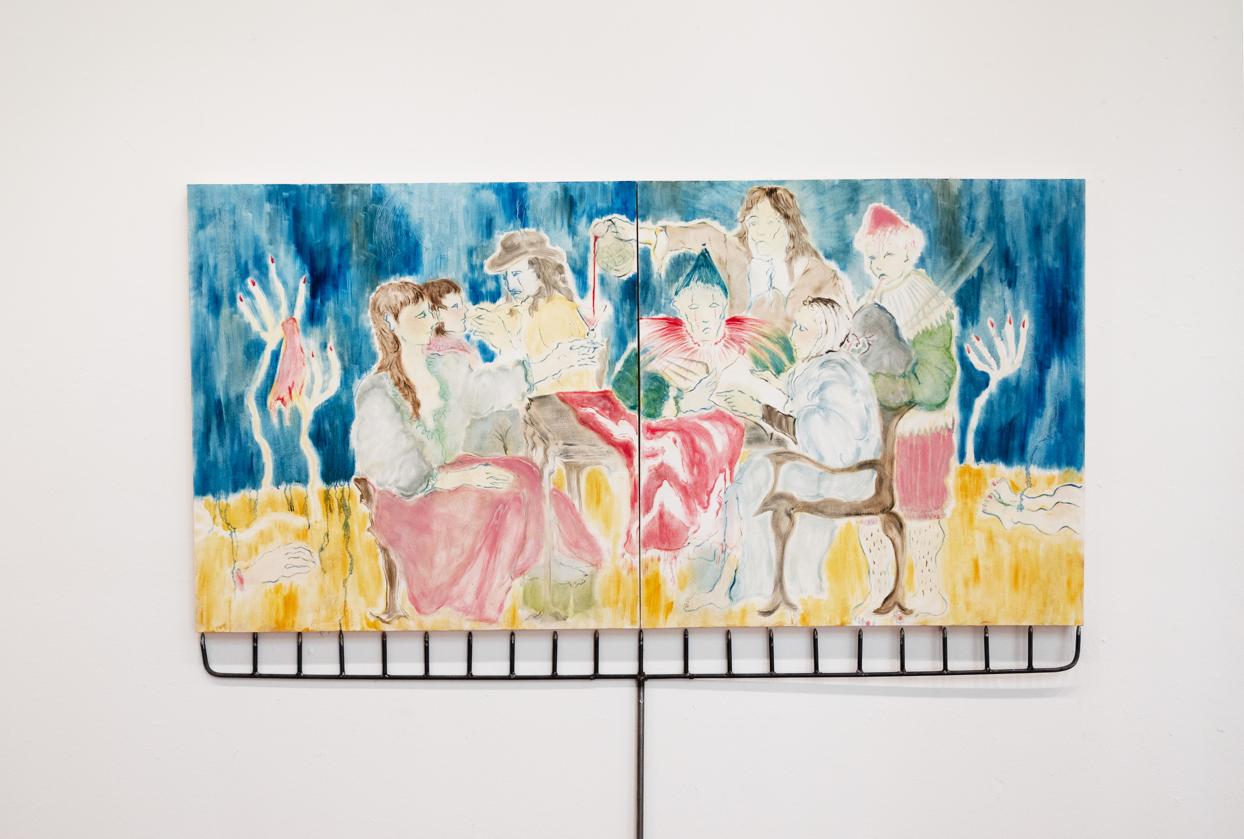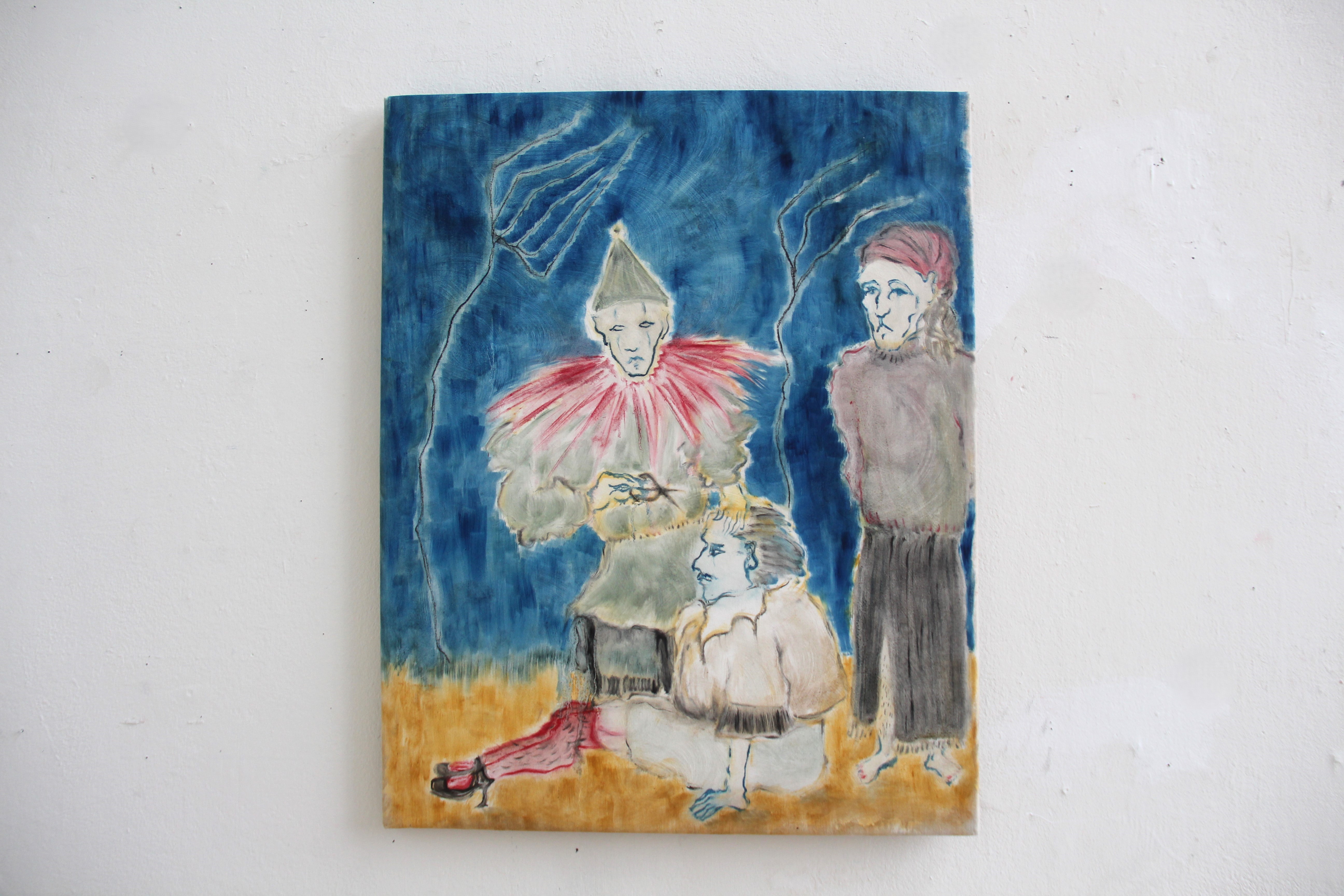 Alex Howey’s work conjures worlds where gender is a fluid action rather than a fixed state, depicting queerness as a perpetual metamorphosis. Rooted in androgyny and defiance, their figures drift through liminal realms shaped by linseed oil’s slippery autonomy and metal’s sculptural gravity. In this friction between softness and steel, Howey lays bare the contradictions of gender and desire: tender, unyielding, forged yet ephemeral. Through the embrace of filmic fragmentation, disembodiment, and nonlinear storytelling, they tend a landscape where queer bodies erupt, detach, and reassemble in resistance to dominant norms. Drawing from nomadic queer cultures and rural living, they craft satirical yet unsettling worlds reflecting post-climate change realities. Drawing from Old Masters, Howey reimagines historical depictions through a queer lens, resisting victimhood and celebrating joy, absurdity, and gender performativity. Howey’s work envisions liberated futures – worlds caught between destruction and renewal – these heterotopias becoming sites of satire and joy, where absurdity meets critique, and liberation grows from the soil of conflict.